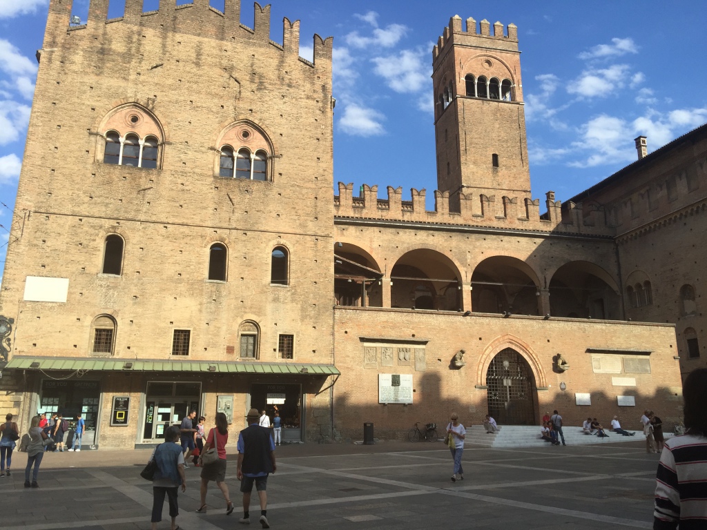 Dookoła placu znajdował się tył budynku Palazzo Re Enzo (dostępny dla zwiedzających, w środku była także informacja turystyczna, odbywają się tu także imprezy), a naprzeciwko znajdował się okazały budynek Biblioteki (Biblioteca Sarabolsa), gdzie można było przycupnąć na schodach. Obok był budynek Ratusza (Palazzo Comunale) przy którym wychodziło się już na główny plac Piazza Maggiore. Plac był ogromny, dookoła same zabytkowe budowle: kolejne trzy pałace: Palazzo d’Accursio (stanowiący część Pałacu Miejskiego, jest tu także muzeum sztuki), Palazzo dei Notai i Palazzo dei Banchi. Do placu przylega także bazylika Basilica di San Petronio. To jeden z najpiękniejszych placów jakie widziałam.