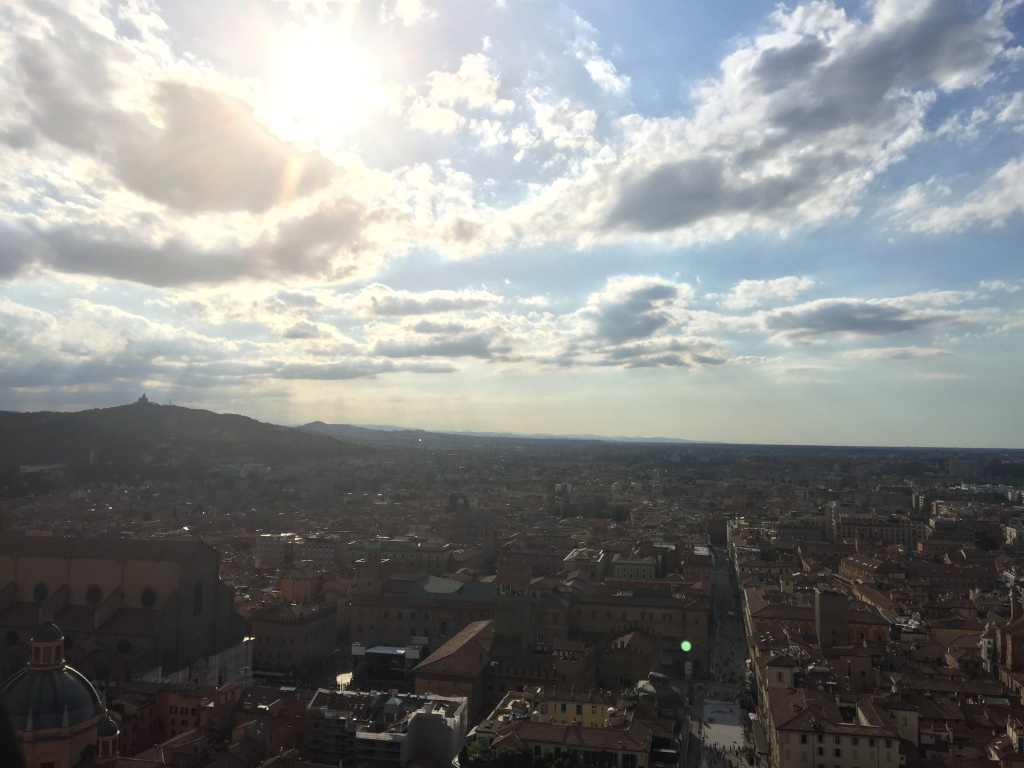 Wieże, a dokładnie 200 wież, było symbolem Bolonii. Kiedyś znajdowały się w całym mieście i stawiane były w obronie przed wrogiem, dziś niestety zostało tylko kilka, z czego właściwie tylko Torre degli Assinieli (najwyższa, mierząca ponad 97m) jest tak okazała i dostępna dla zwiedzających. Stojąca obok niej niższa wieża była budowana jako pierwsza, ale zauważono, że jest ona pochyła i zaprzestano budowy, gdyż groziło to zawaleniem, dlatego nie została ukończona. Nie sposób było więc odmówić sobie wejścia na symboliczną wieżę Assinieli. Cena wstępu to 3€, nie było w niej windy, cała droga prowadziła przez wąskie schody. Widok z wieży był niesamowity: panorama pięknego skąpanego w słońcu miasta pełnego ciasno postawionych czerwonych budynków.