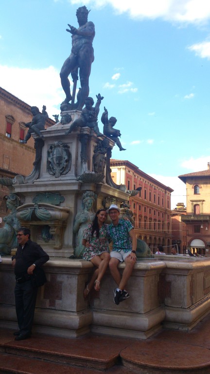 Gdy zeszliśmy z wieży skierowaliśmy się do głównego placu: Piazza Maggiore, po drodze przechodząc przez Piazza del Neptuno, na którym znajdowała się piękna fontanna Fontana del Nettuno, gdzie wrzuciliśmy na szczęście po centusiu.