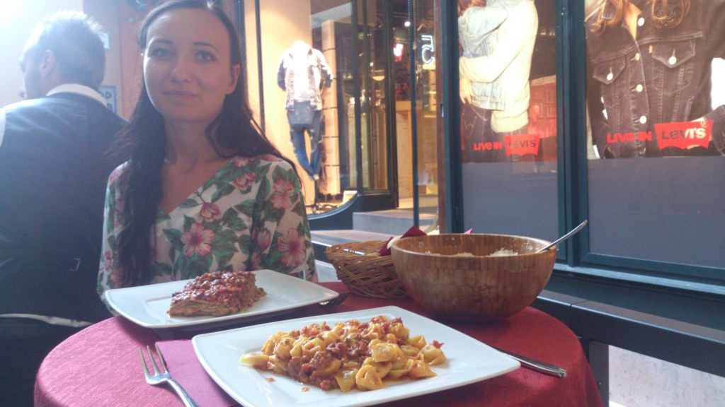 Dalej przechadzaliśmy się uliczkami starego miasta, pełnymi restauracji, sklepów z serami i mięsem i upajaliśmy się klimatem. Co ciekawe Bolonia chyba nie jest jakimś bardzo turystycznym miastem, bo nigdzie nie mogliśmy znaleźć magnesów, ani innych pamiątek. A szkoda, bo jest naprawdę piękna, trochę tajemnicza z pięknymi zabytkami, urokliwymi uliczkami i pysznym jedzeniem! Zatrzymaliśmy się na kolację w jednej z małych restauracyjek przy stoliku na zewnątrz. Bo jak być w Bolonii i nie spróbować sosu bolońskiego? Zamówiłam lasagne bolognese, Mateusz tortellini ragu (coś podobnego do bolognese). Pan kelner przyniósł nawet osobny taboret dla mojej torebki. Przed daniem otrzymaliśmy pyszne bułeczki i parmezan, a danie główne było przepyszne.